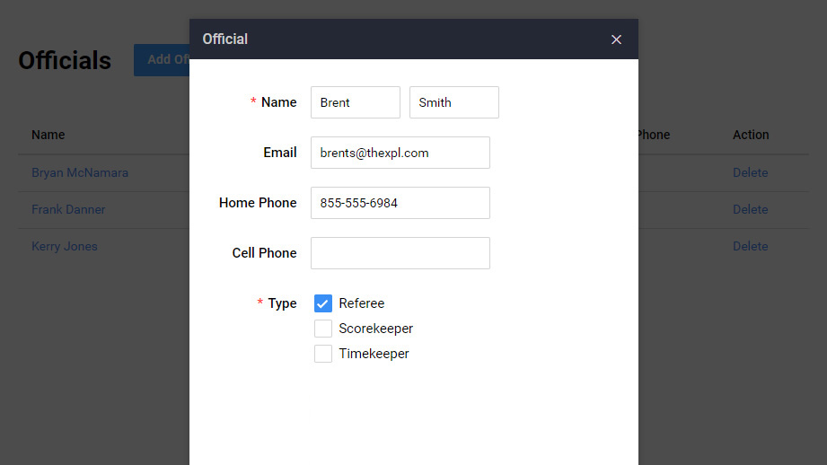 You can manage a list of your referees and scorekeepers. Officials can be assigned to games. A report can be run to determine the number games an official has worked.
