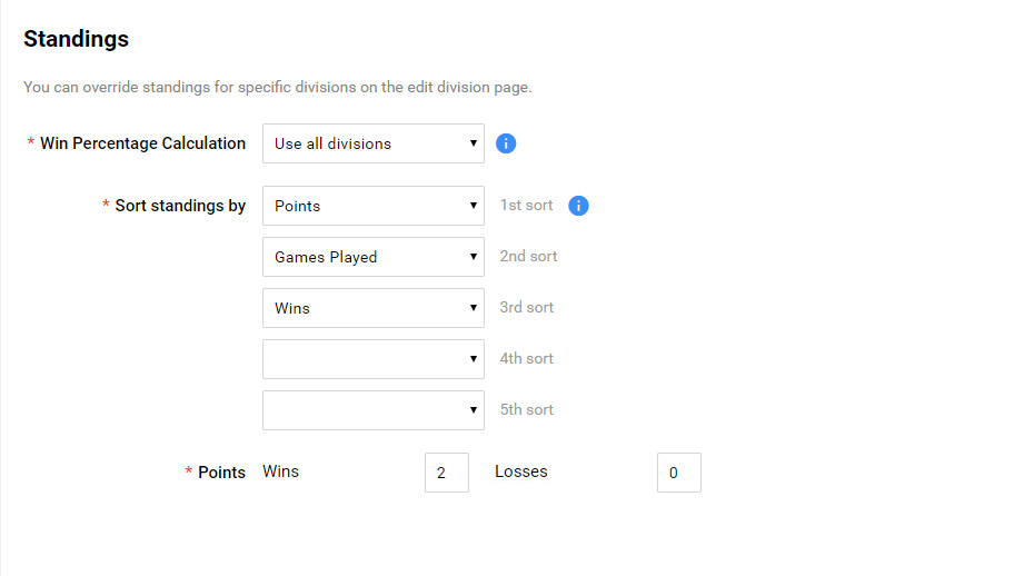 You can rank your team's standings by 12 different options. Points awarded for game outcomes can be changed for every outcome.