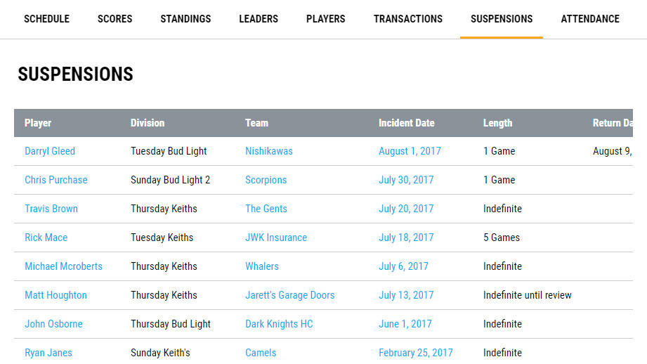Display the league's suspended players.